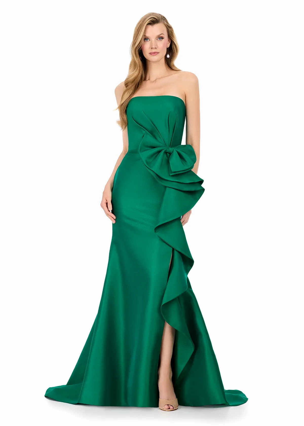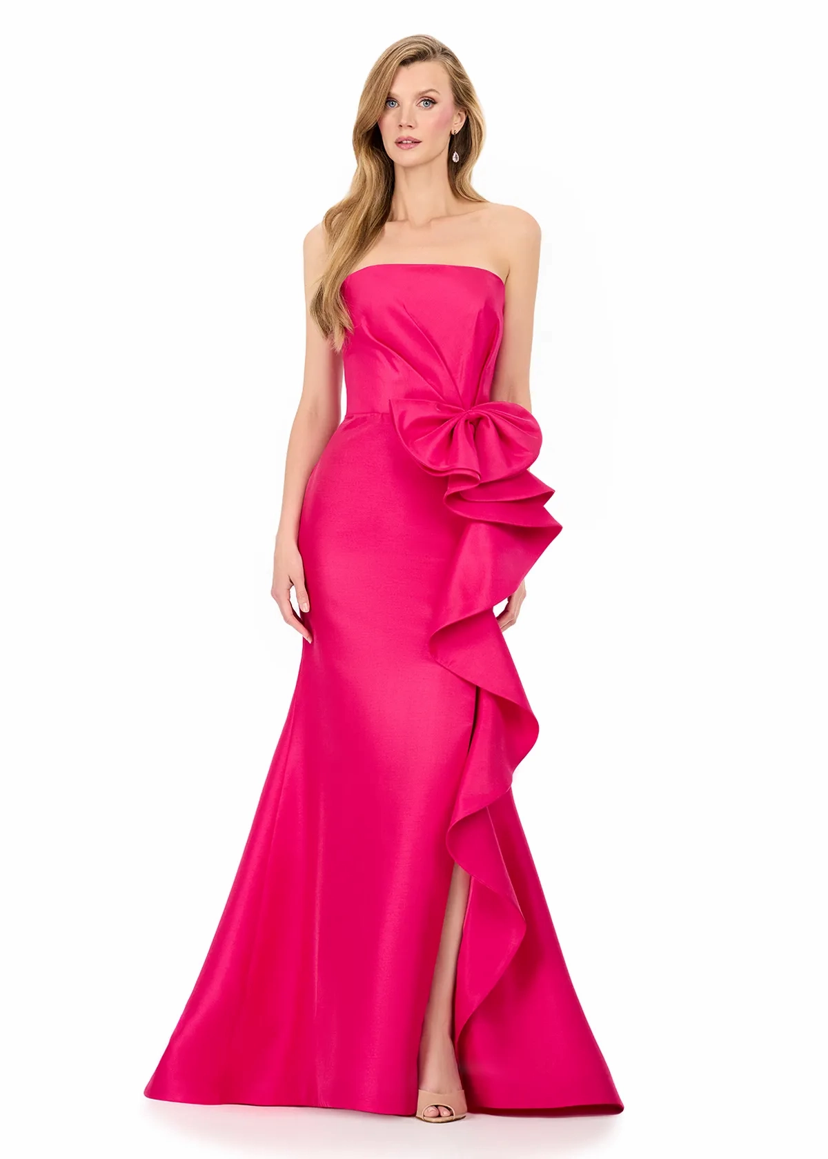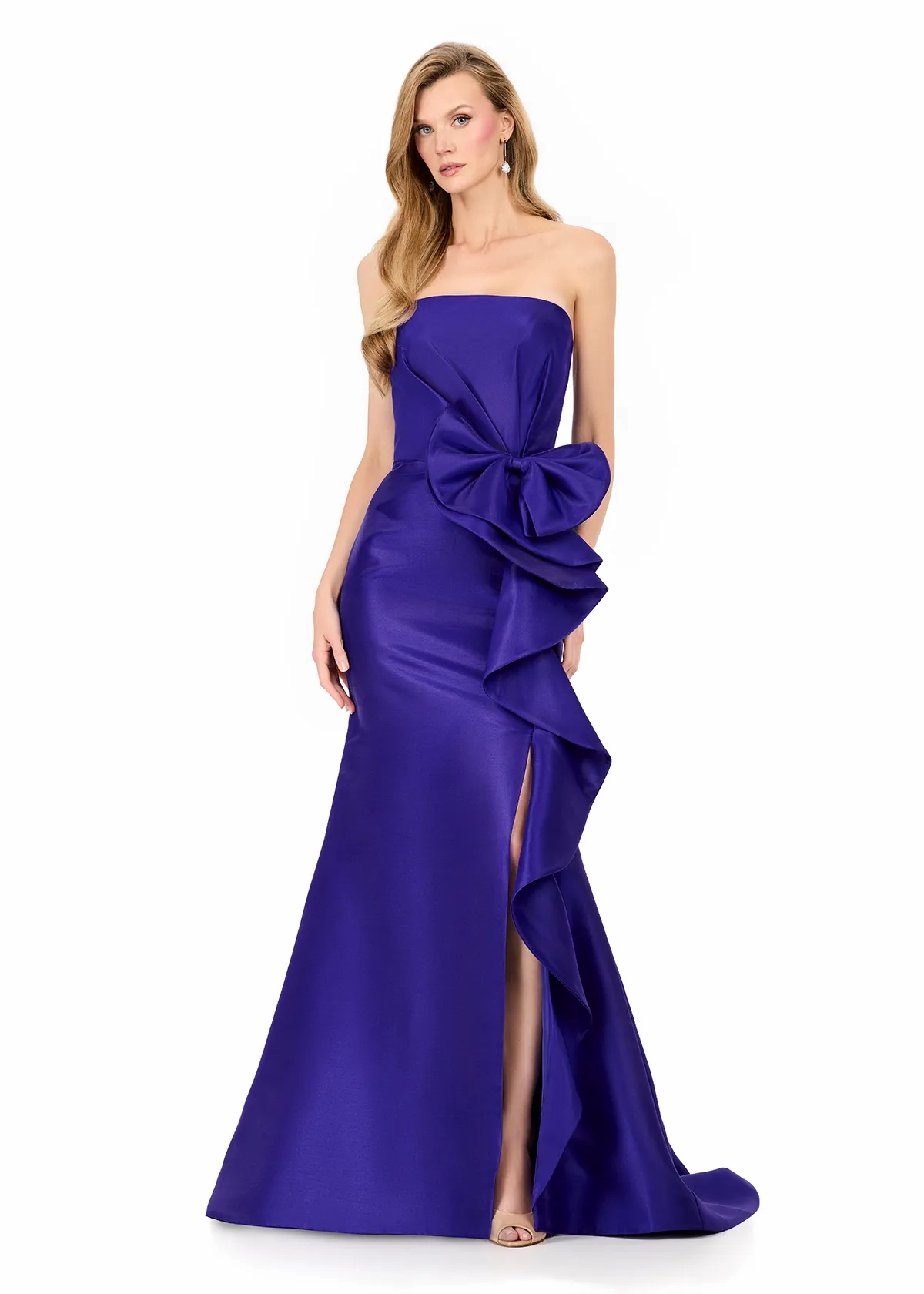 Turn heads in ASHLEYlauren Style E12216, a sleek strapless mermaid gown designed to stun with its modern structure and dramatic oversized bow detail. Crafted in luxurious mikado, this timeless yet fashion-forward silhouette brings elevated glamour to every special occasion.