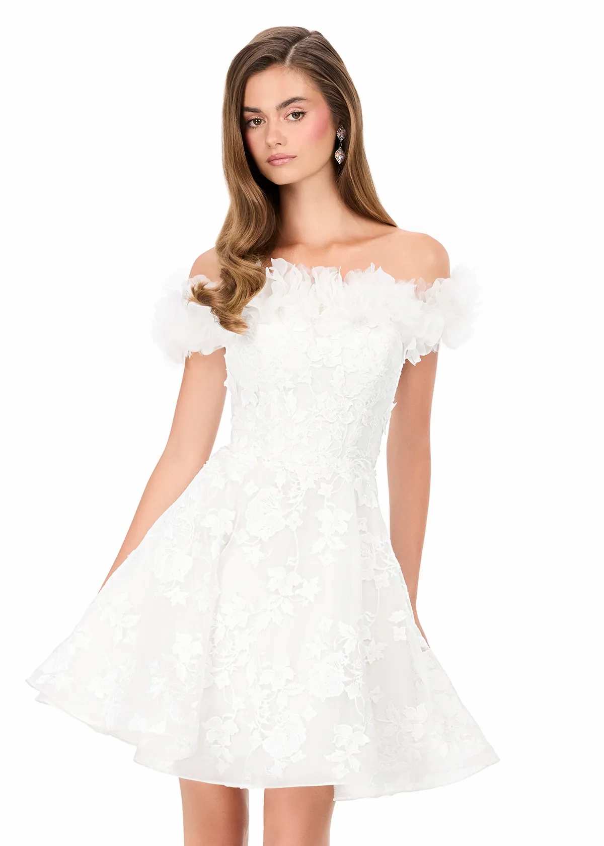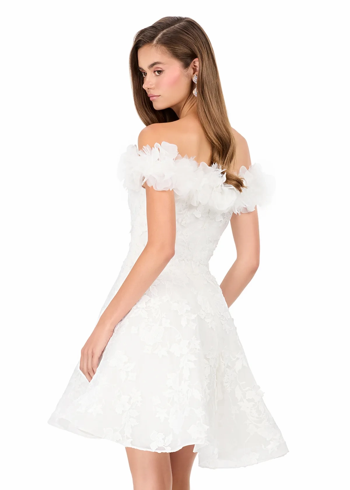 Step into fairytale romance with ASHLEYlauren Style E4942, a dreamy short gown adorned in dimensional floral appliqués and whimsical ruffle off-shoulder sleeves. This enchanting silhouette blends soft bridal elegance with playful movement, making it the perfect statement style for your most magical celebrations.