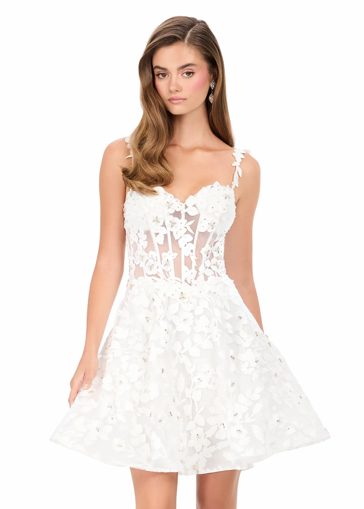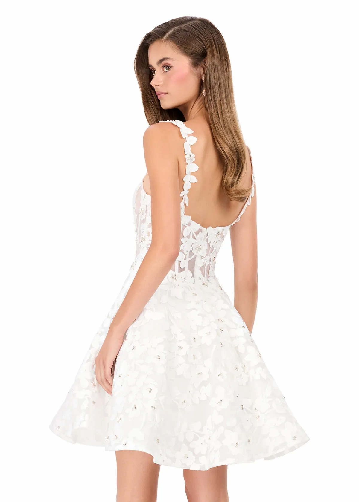 Make a stunning entrance in ASHLEYlauren Style E4943, a flirty and feminine short dress designed with dimensional floral appliqués and a chic sheer corset bodice. This romantic A-line silhouette blends bridal-inspired elegance with modern fashion appeal, creating the perfect look for any special moment.
