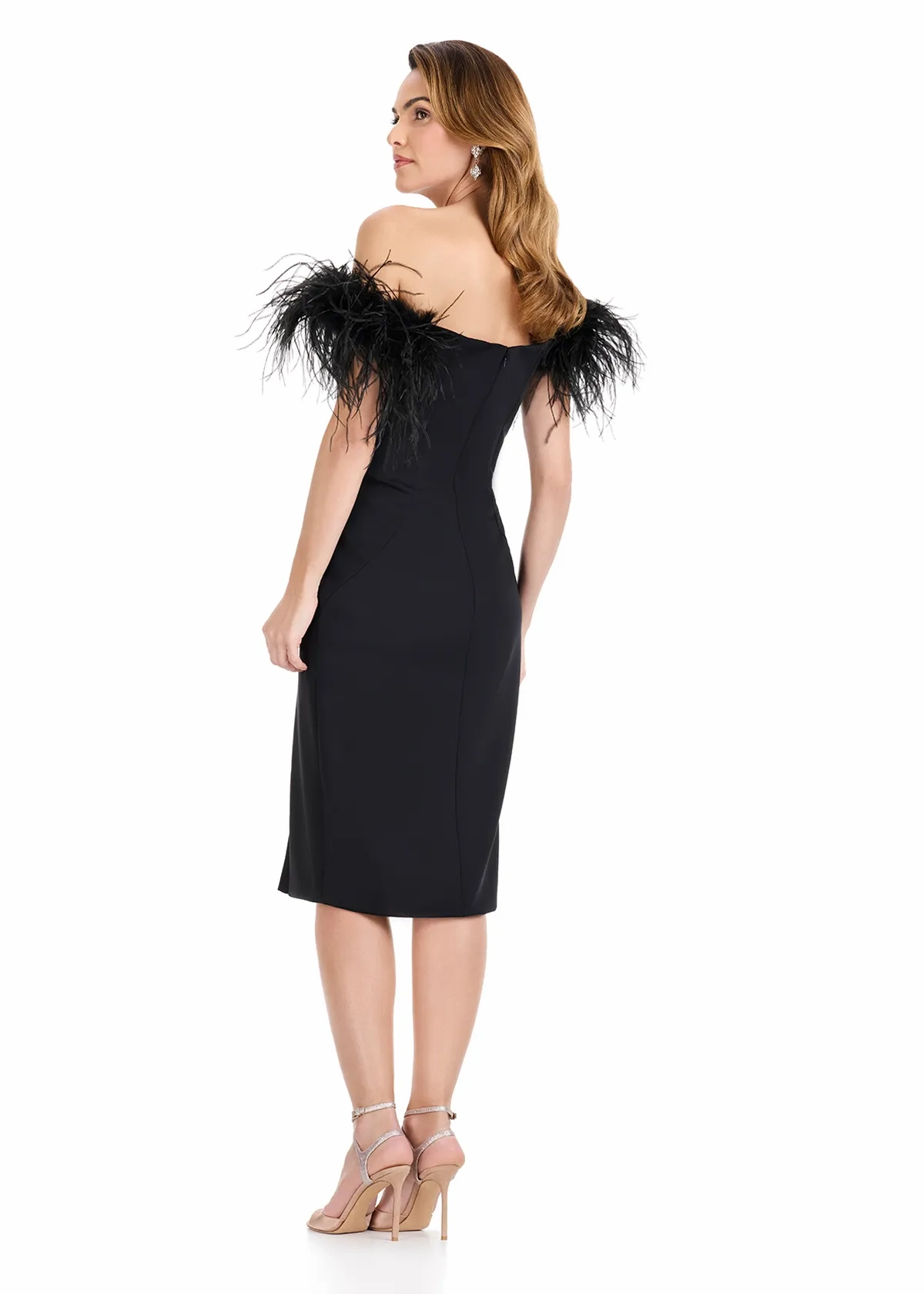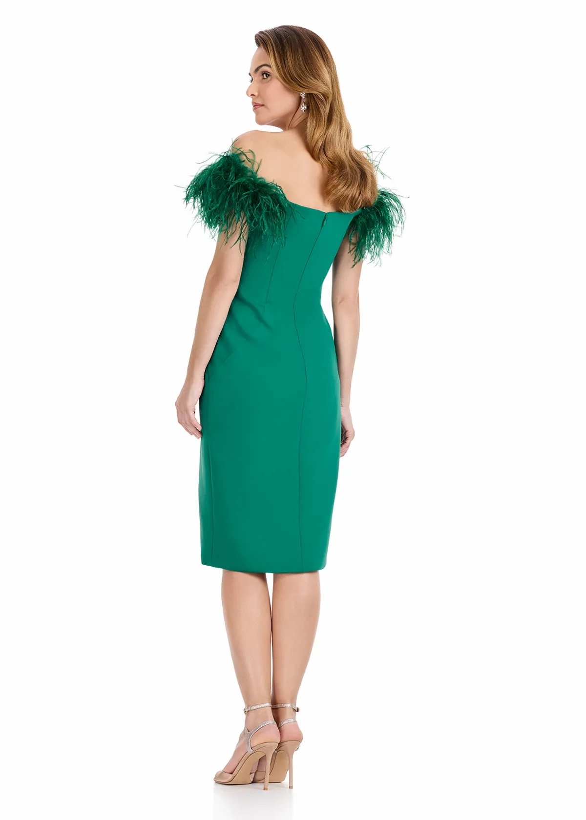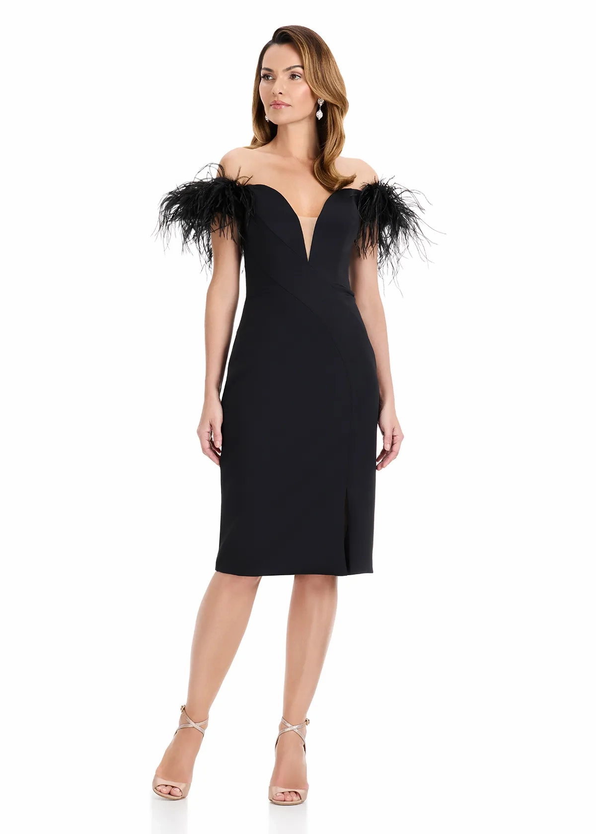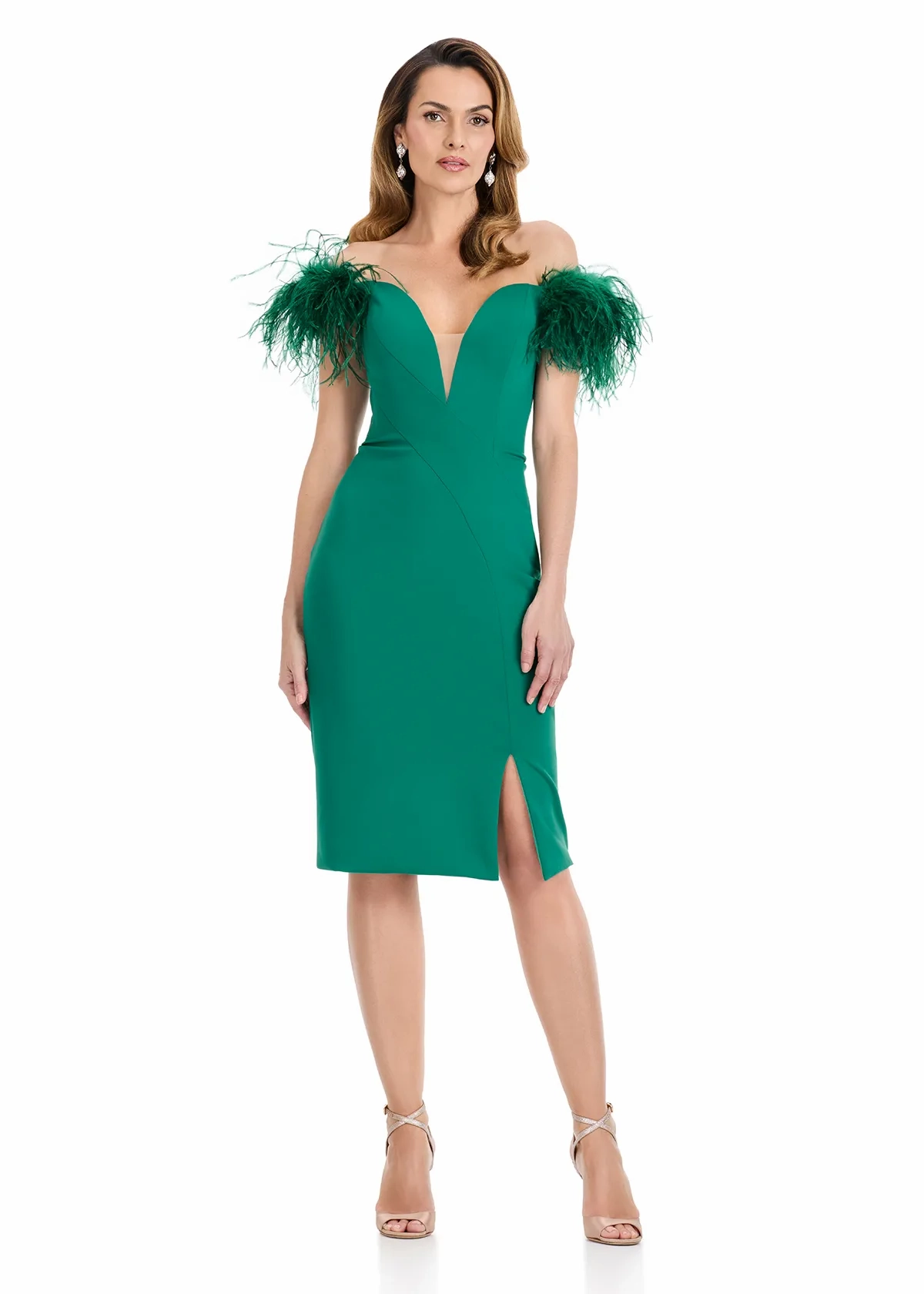 Make a bold and fashion-forward entrance in ASHLEYlauren Style E4959, a chic off-the-shoulder midlength cocktail dress featuring luxe feather details and a sleek, figure-hugging silhouette. This modern statement piece blends elegance with high-fashion drama, perfect for the woman who loves to stand out.