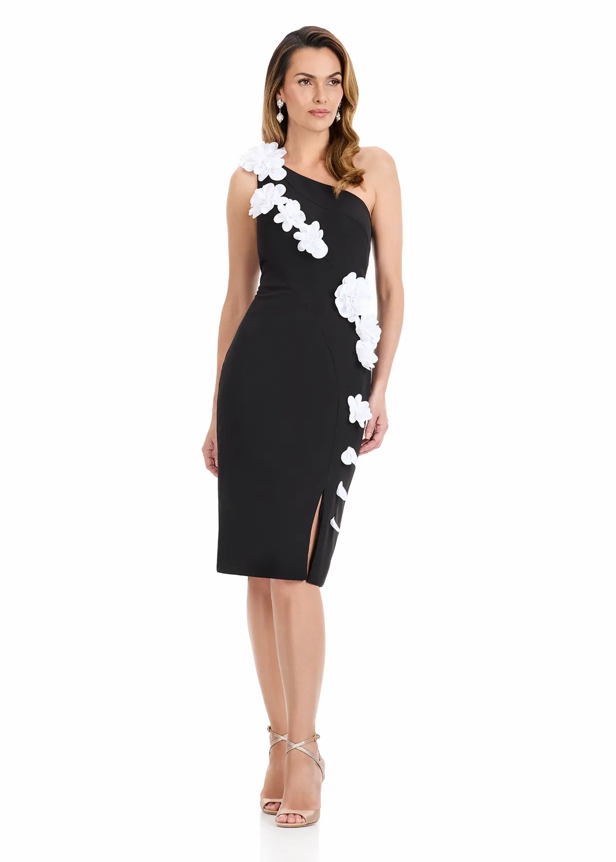 Turn heads in ASHLEYlauren Style E4961, a sophisticated one-shoulder cocktail dress designed to deliver modern glamour with a touch of dramatic floral elegance. Crafted in luxe stretch jersey for a flattering, sculpted silhouette, this mid-length dress is adorned with dimensional appliqué flowers cascading along the neckline and bodice—creating a statement look that blends romance and runway-inspired style.