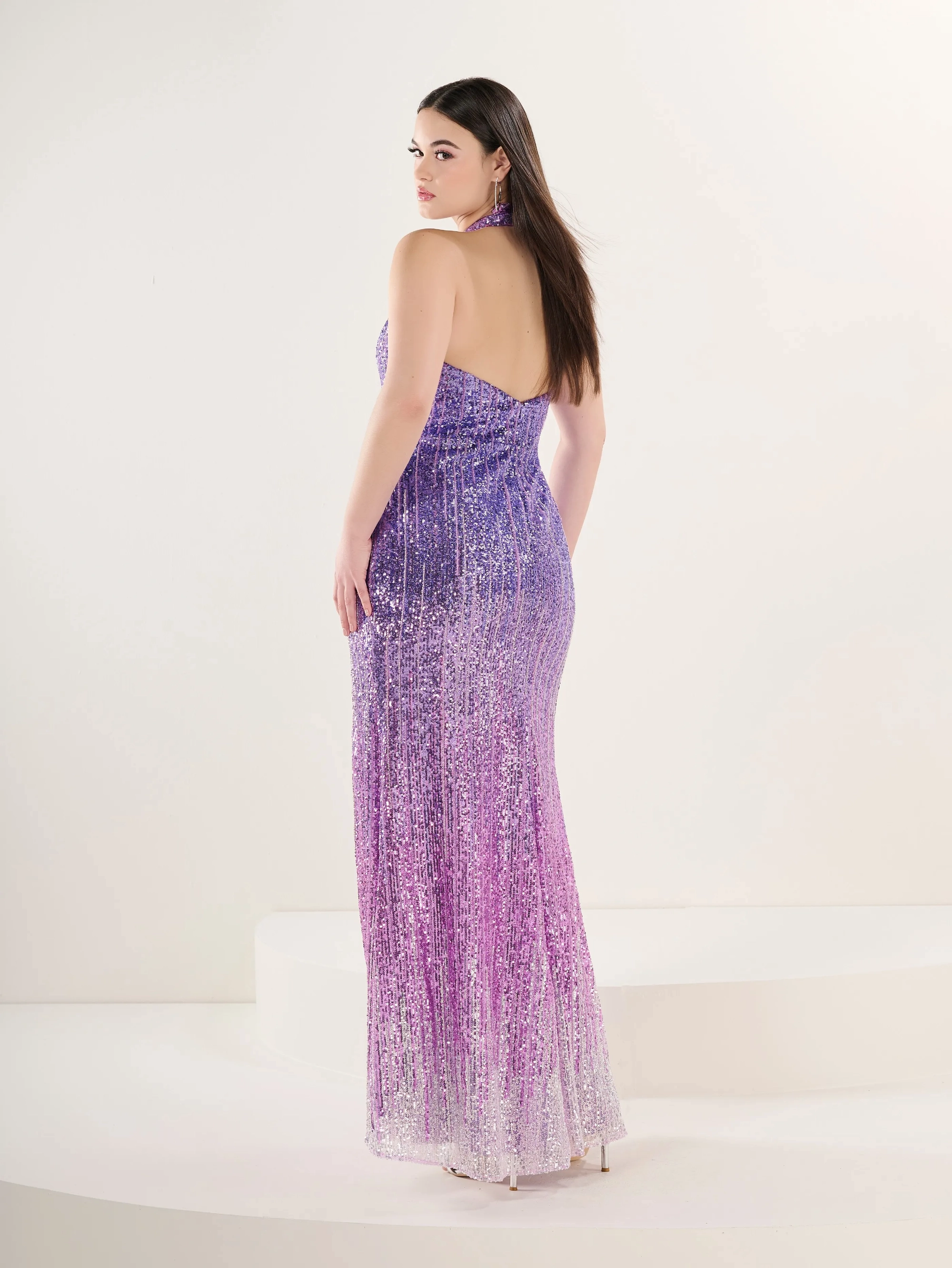 A plunging halter in ombre linear sequin, this gown features a side split and low back.