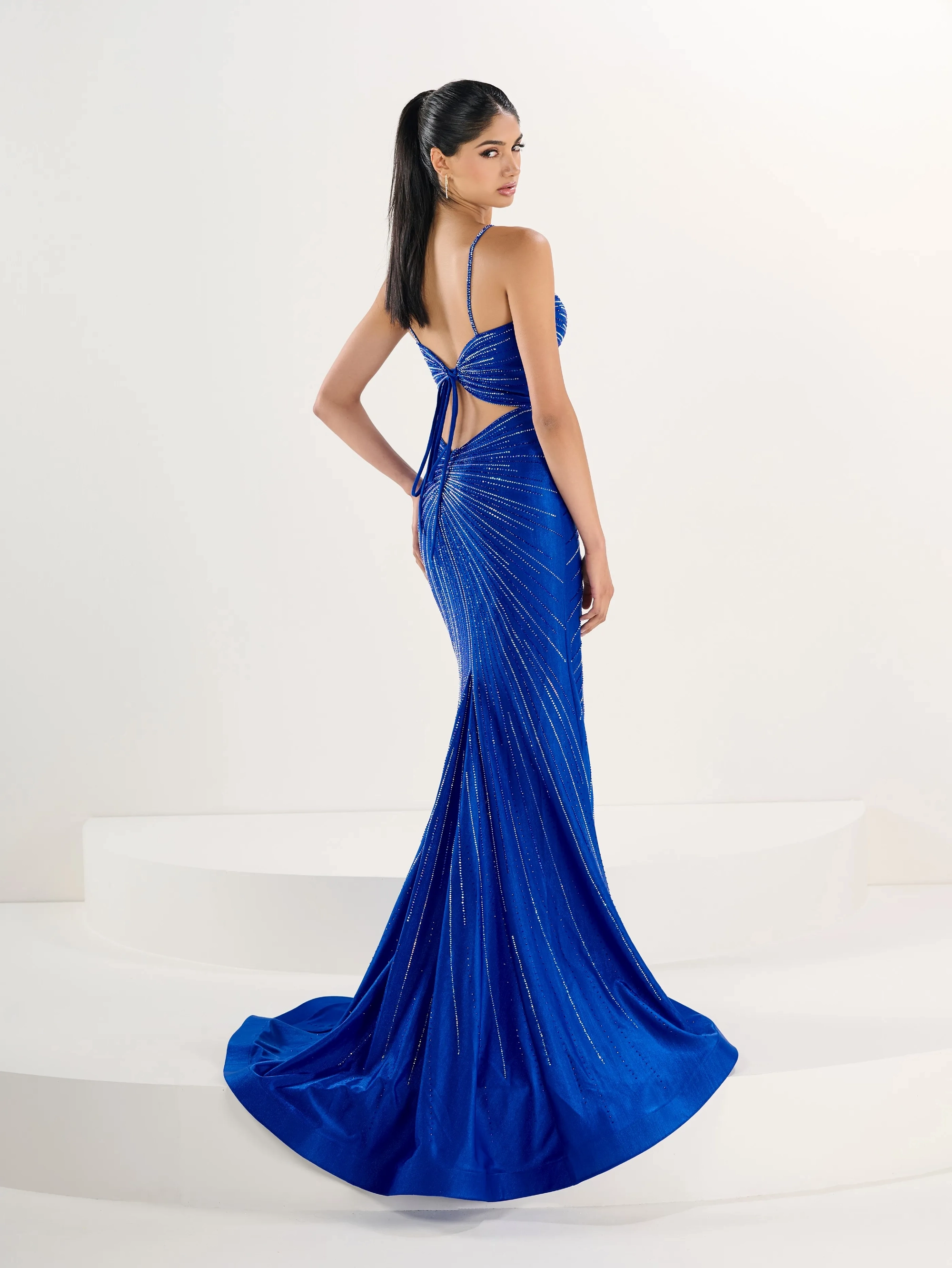 Make a bold entrance in this electrifying royal blue shimmer satin gown. The fitted silhouette features a flattering sweetheart neckline supported by delicate spaghetti straps. Radiating rhinestone embellishments cascade from the center outward across the bust and bodice, creating a stunning starburst illusion that enhances the waistline. Ruching at the waist and hip creates sculpting texture, while a daring thigh-high slit adds drama and movement to the floor-length skirt. The back stuns with an open design anchored by crisscrossing straps and a stylish knotted bow detail at the lower back. The starburst rhinestone pattern continues from the bodice through the hips and cascades down the skirt, elongating the figure and adding sparkle with every step. The skirt flows into a sweeping train for a graceful and glamorous finish.