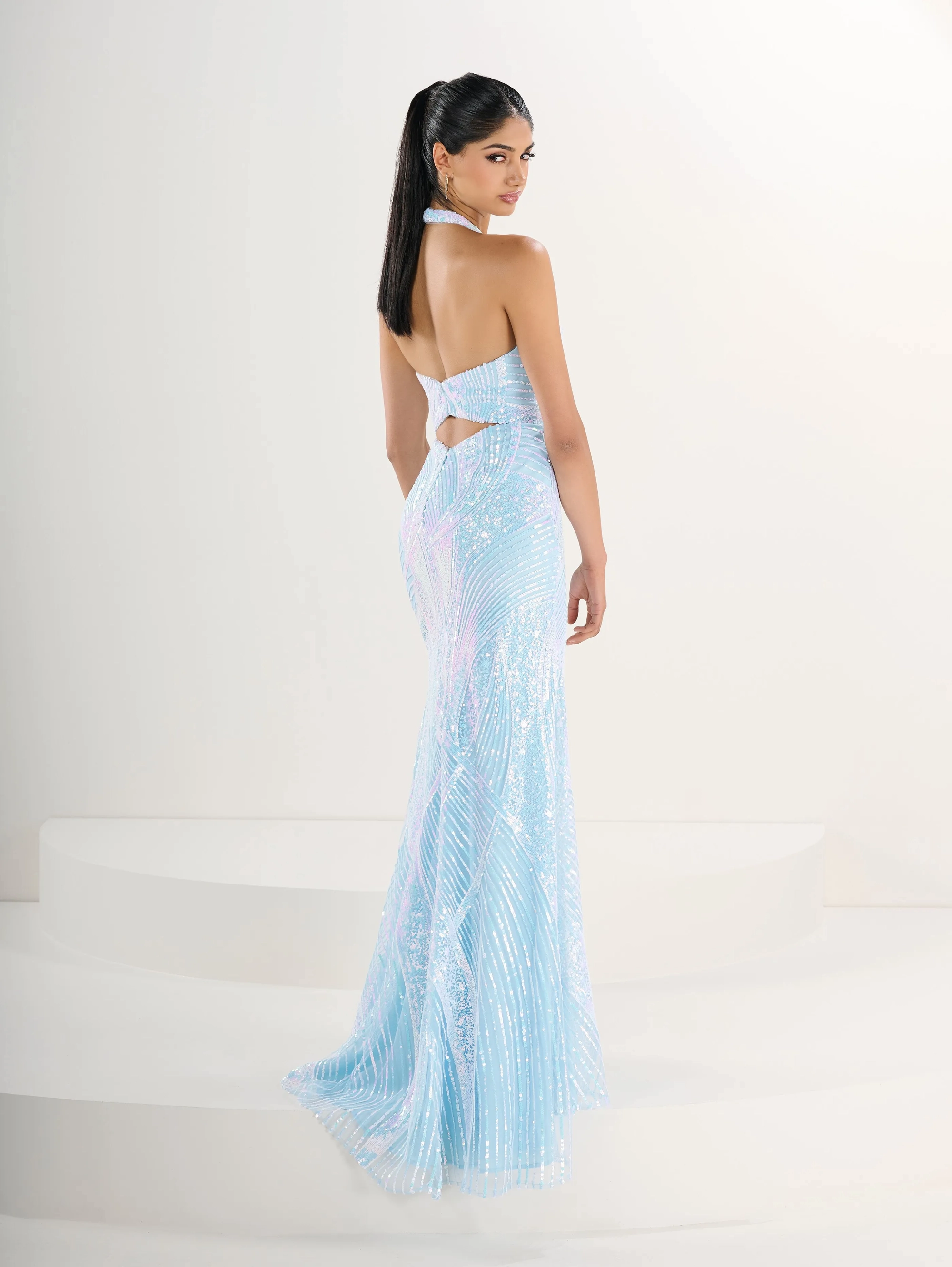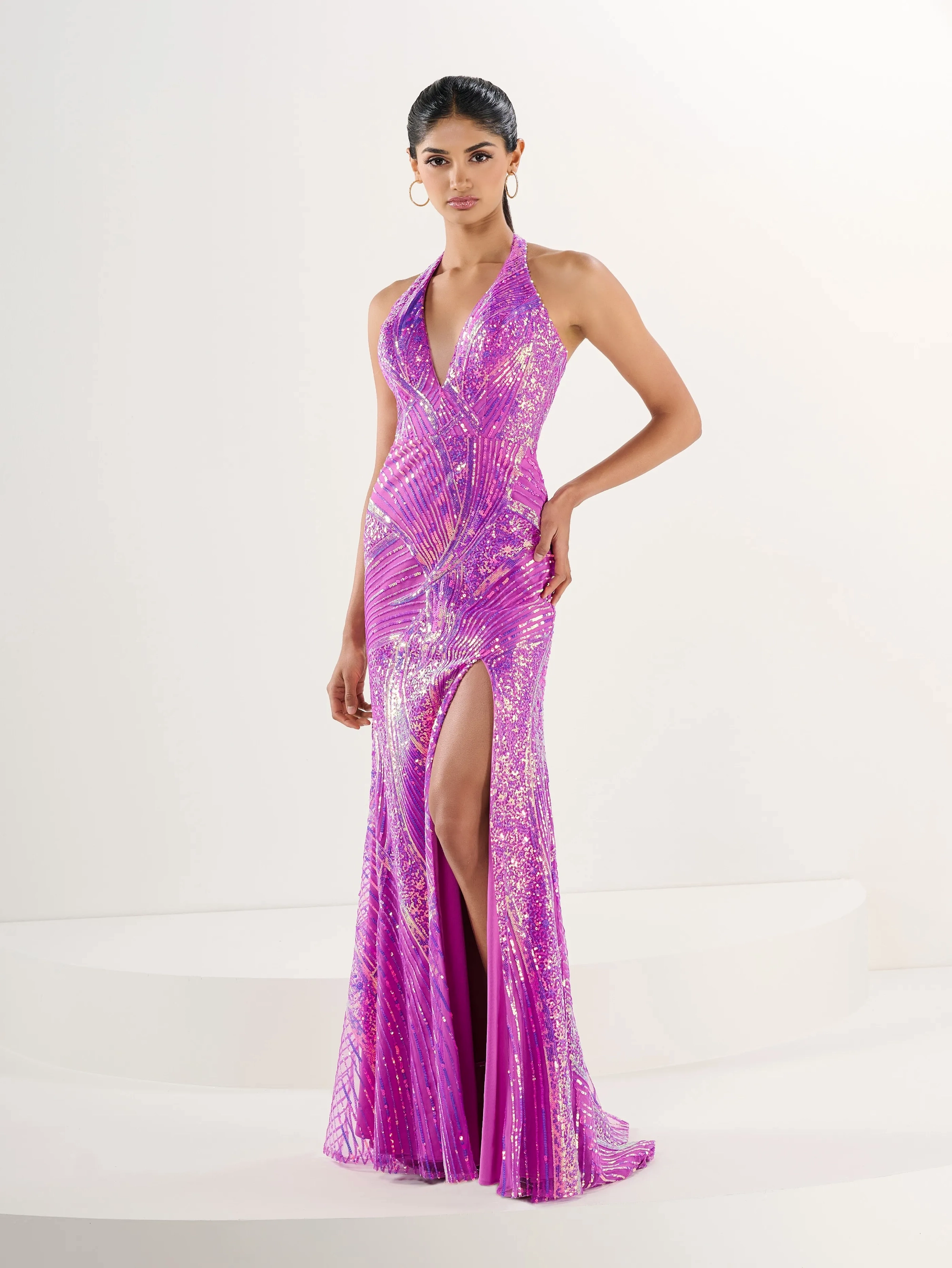 A sculpted halter neckline with a deep V and side split are the focal points of this abstract sequin gown.