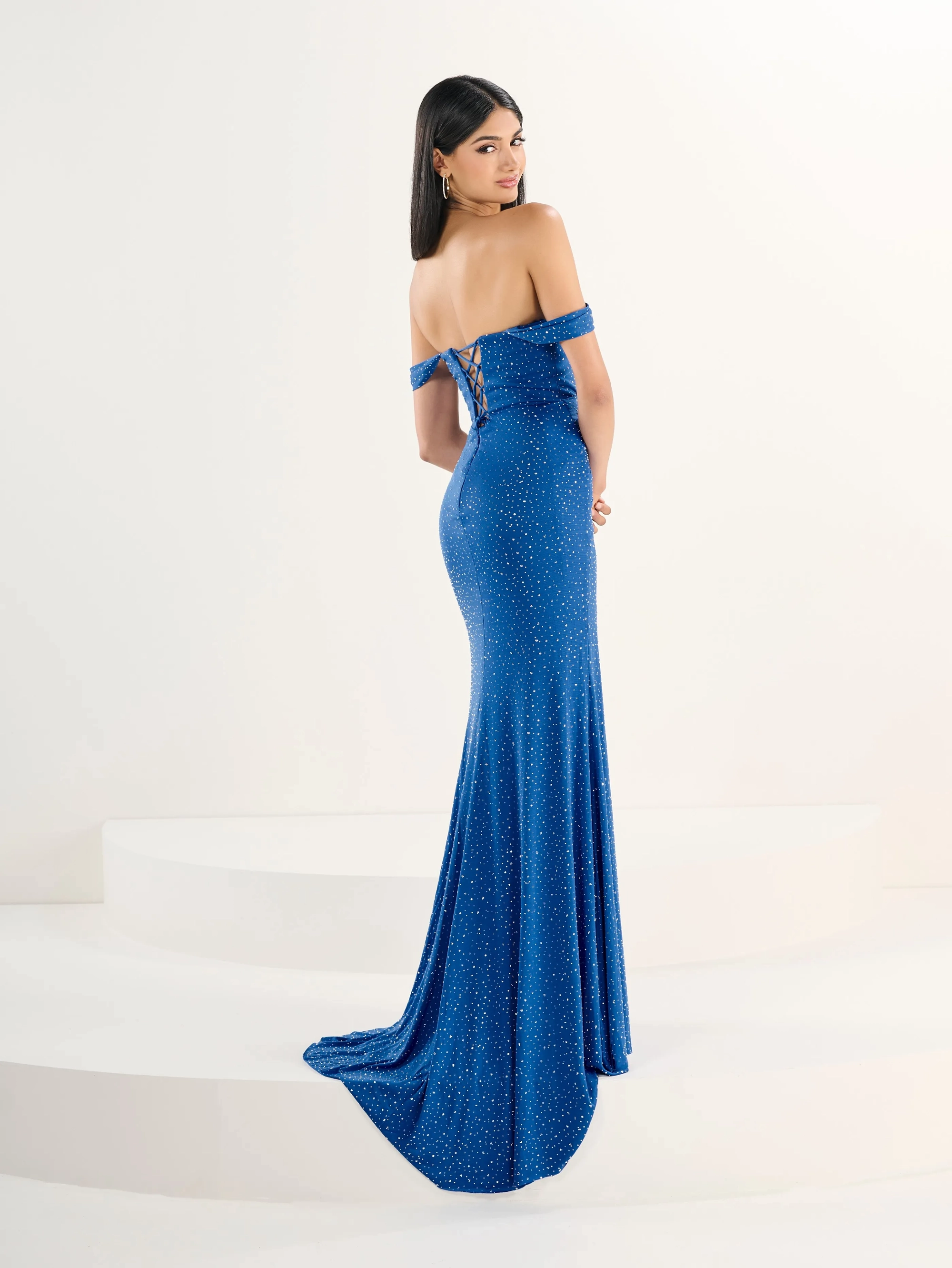 Off the shoulder stretch jersey fit and flare with micro heat set silver crystals, illusion bodice and lace up back.