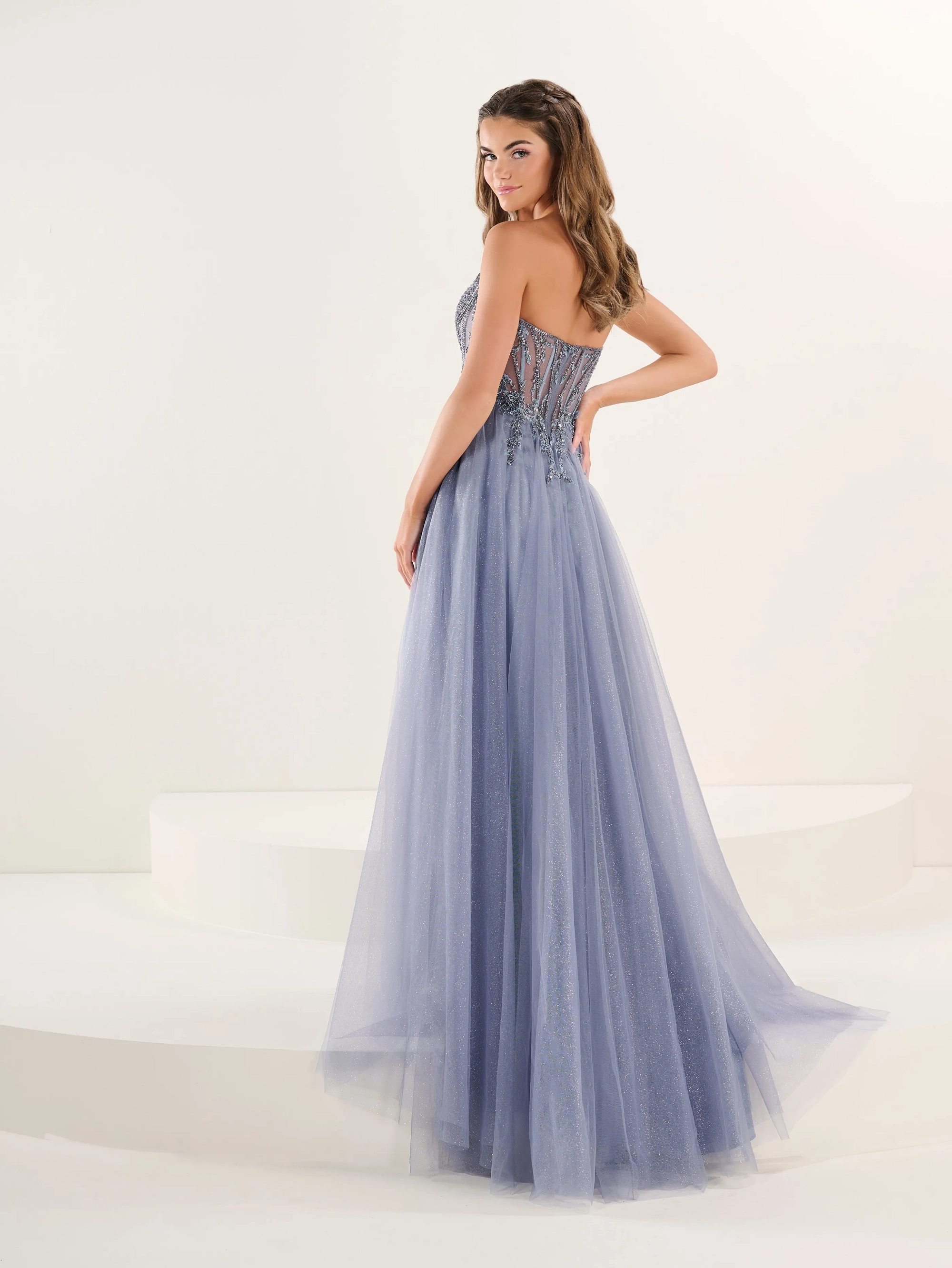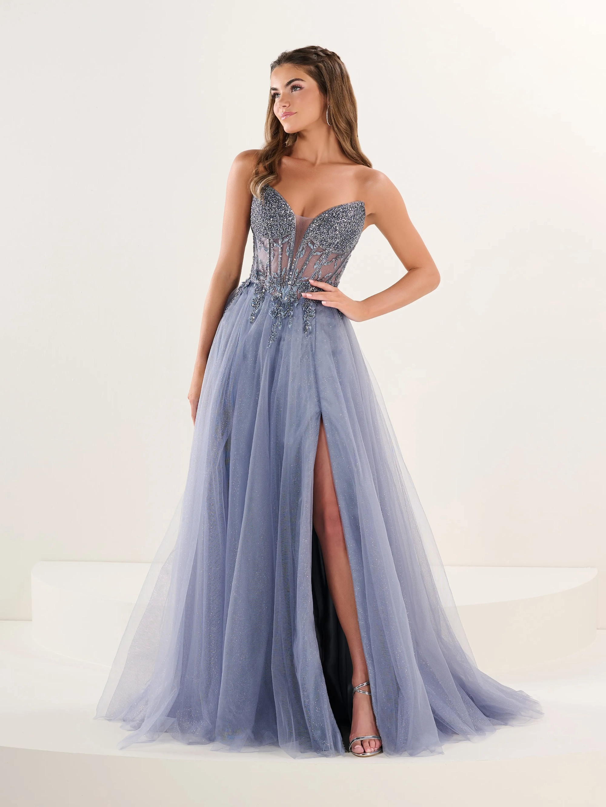 A-line with a flowing full-length skirt, deep sweetheart neckline with a structured, semi-sheer corset bodice. Lace-up illusion back with boning details, providing a cinched waist effect, high side slit for a bold and modern touch, light sweep train adds elegance and movement.